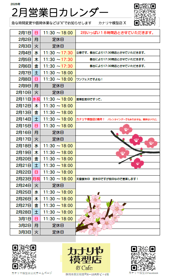 ■店舗概要■店舗名:カナリヤ模型店&Cafe 静岡市葵区紺屋町8-13内野ビル1階 google map054-293-6661 キャッシュレス・インボイス制度対応 11:30〜19:00 定休日: 月・火※日曜日は、18:00 閉店 店主 山田明子(ゴム動力舎)