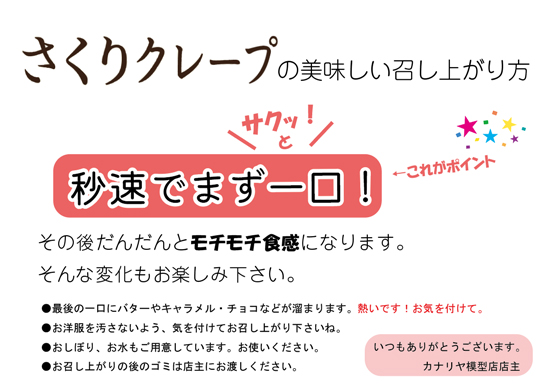 ■お取り扱い商品■カナリヤ模型店部門プラモデル、工具、タミヤアクリル塗料、 vallejo(ファレホ)、 接着剤、溶剤静岡のお土産物(クワザーシリーズ、プラモニュメントのアクスタ) カフェ部門さくりクレープ 500円〜ふわふわかき氷(夏期) The COFFEE ROSTER監修 各種ドリンク (ガンプラはございません、すみません) 臨時休業のお知らせはHPの掲載に間に合わない場合も多いのですが